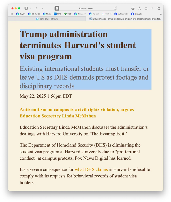 Bộ An ninh Nội địa Hoa Kỳ (DHS) đã chấm dứt chương trình thị thực du học tại Đại học Harvard do các cuộc biểu tình bị cáo buộc là "ủng hộ khủng bố", theo Fox News. Quyết định này được đưa ra vào ngày 22/5/2025, xuất phát từ việc Harvard bị cho là không tuân thủ yêu cầu cung cấp hồ sơ hành vi của các sinh viên nước ngoài đang giữ thị thực.