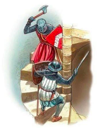 Vì phần lớn binh lính thời đó thuận tay phải, nên khi họ cố leo lên cầu thang xoắn ốc theo chiều kim đồng hồ, cánh tay thuận sẽ bị vướng vào trục tường trong, khiến việc vung vũ khí trở nên khó khăn hơn, họ cũng buộc phải lộ diện trong quá trình leo cầu thang này. Trong khi đó, quân phòng thủ từ trên đi xuống lại có lợi thế rõ rệt, khi tay thuận hướng ra ngoài, dễ dàng tấn công mà không bị cản trở bởi tường. Ngoài ra, họ còn có thể sử dụng bức tường bên trong như một lá chắn nữa.