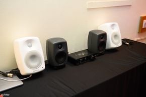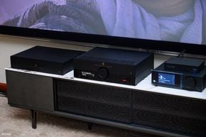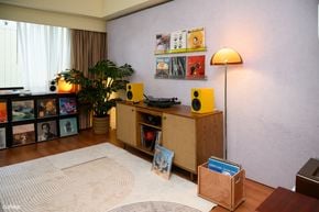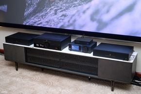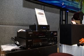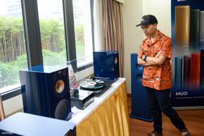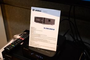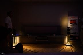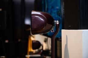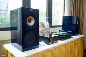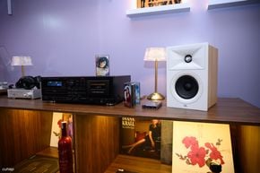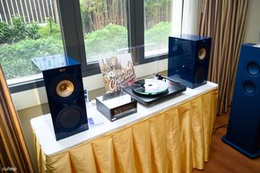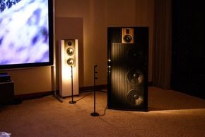 Còn ở hai bên là một cặp loa khác, Steinway Lyngdorf, cũng do ngài David Lyngdorf thành lập, lấy cảm hứng từ những cây dương cầm nổi tiếng của Steinway & Sons. Trong hình, cặp loa đen với lớp lưới không khác gì dàn dây của đàn dương cầm là Model B, ghép với bộ xử lý tín hiệu âm thanh P100 2.1, và poweramp cũng của hãng: