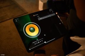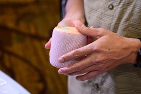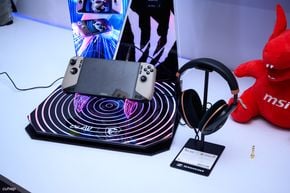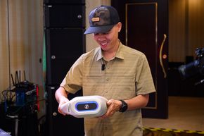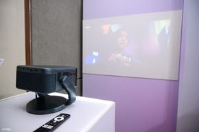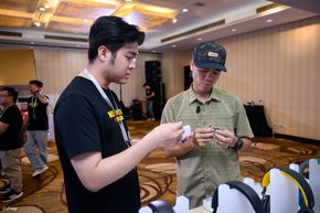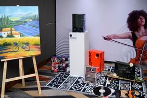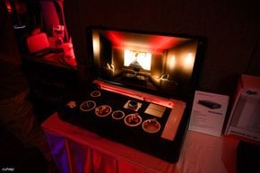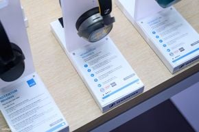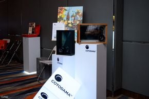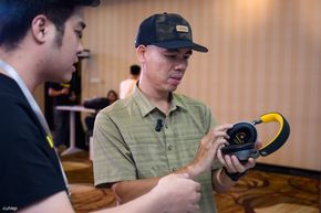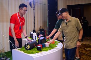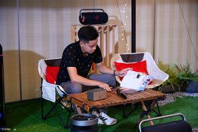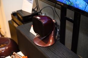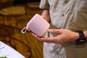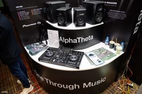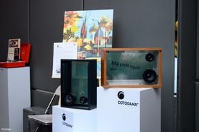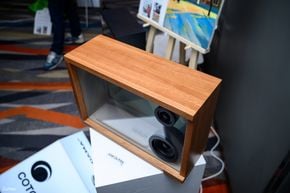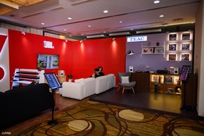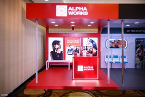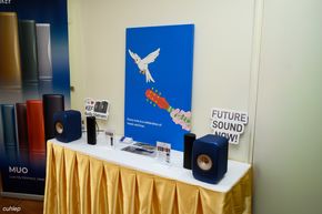 Gian hàng của AlphaWorks chia thành hai khu vực, một dành cho những cặp tai nghe không dây, và một khu vực giống nơi cắm trại để trình diễn loa di động:
