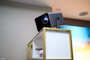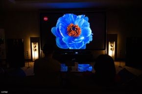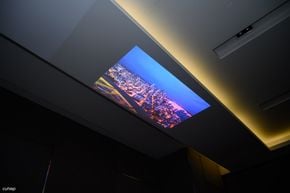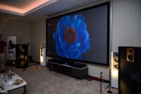 Ở một góc khác là Cine 1 của Leica, máy chiếu tầm gần kích thước 120 inch, ghép với loa kính Waterfall Audio Niagara XT1, rất gọn, chỉ cao có 1 mét mà đẹp lắm: