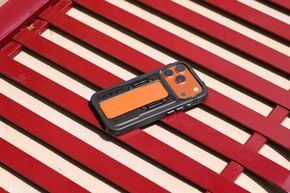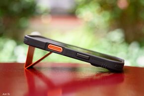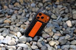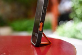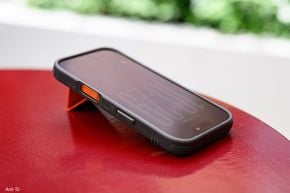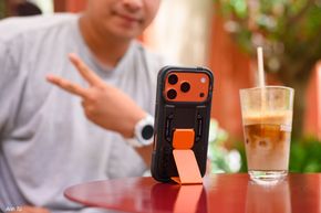 Một góc nhìn khác, nó có một cái stand được gấp gọn lại màu cam y như cái cà vạt vậy đó, đây là một chi tiết cách điệu rất hợp vớiiPhone 17 Promàu cam. Nếu anh em nào không mua màu cam thì vẫn có thể dùng ốp này để có màu cam với bạn với bè haha.